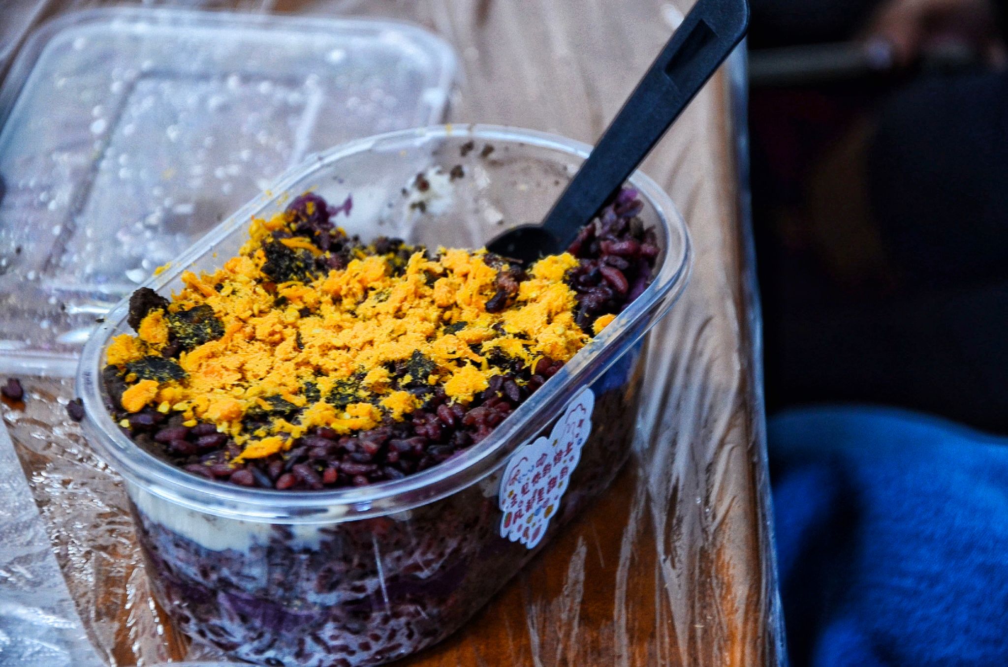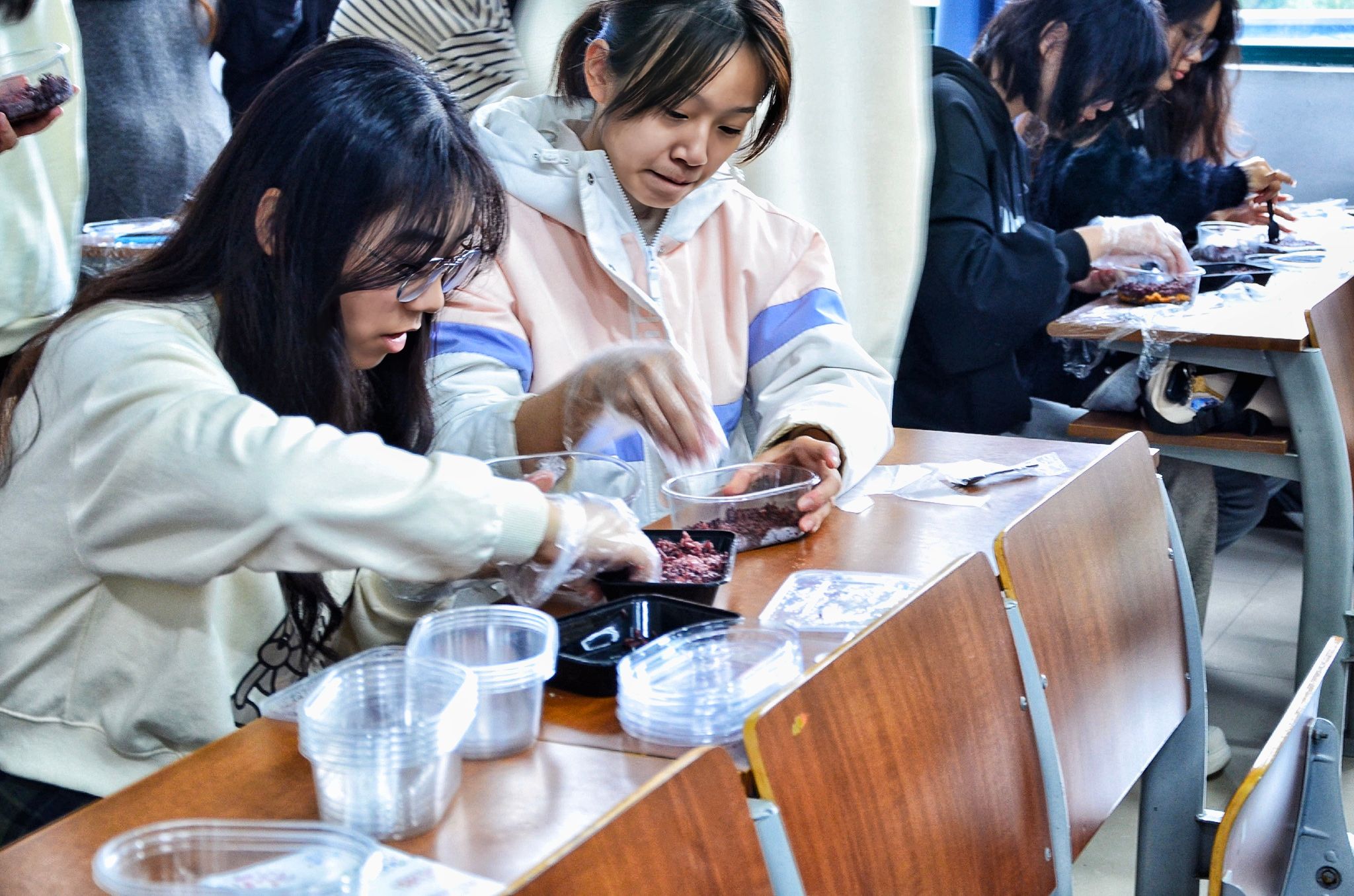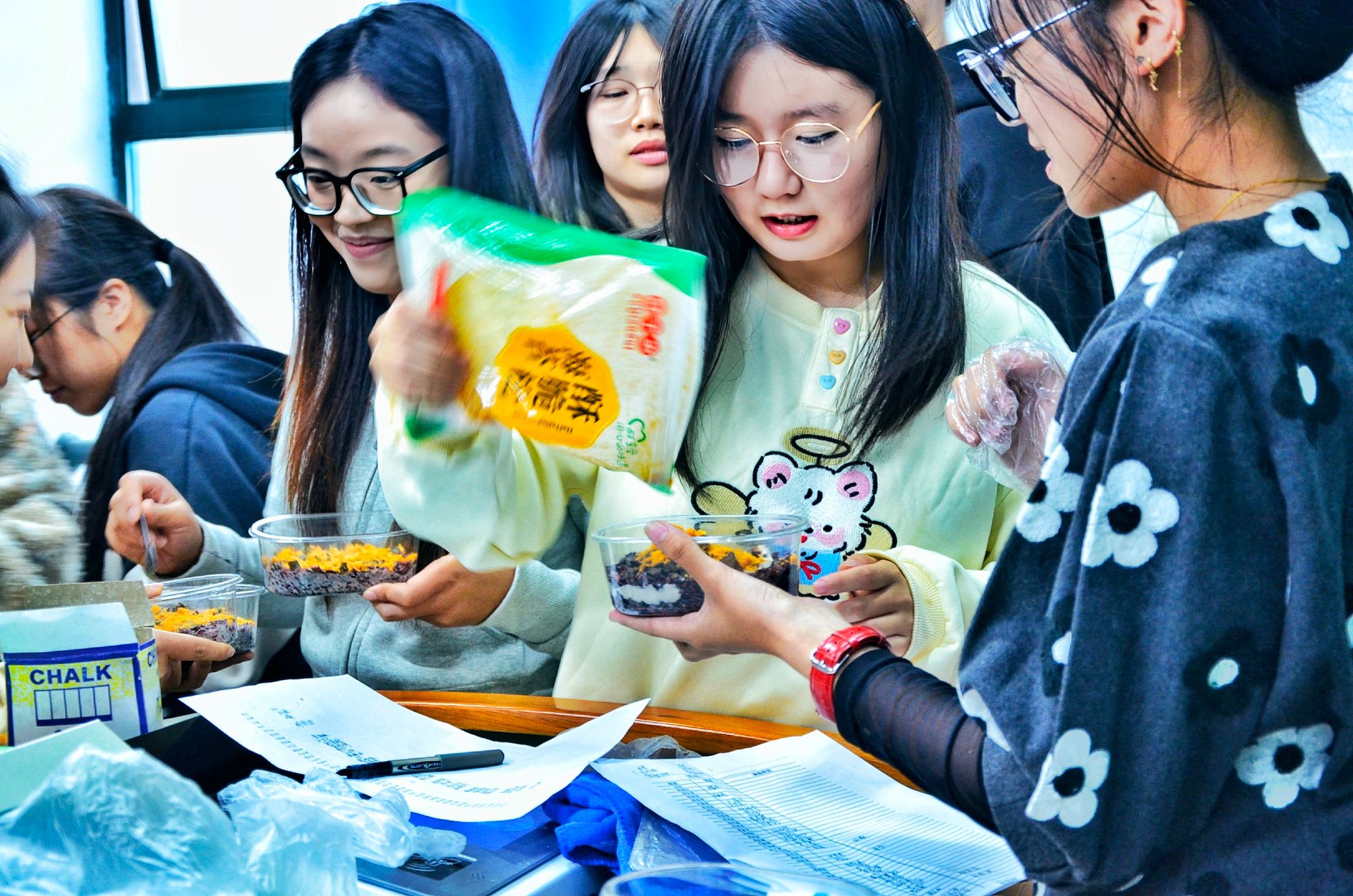 活动伊始,食协干事们逐一给每位同学分发材料,随后,大家共同投入到紫米芋泥盒子的制作中。制作过程融洽而有趣,同学们首先准备好塑料盒,然后在塑料盒里均匀铺上紫米,按压成方形。接着,铺上一层紫薯,再铺上芋泥。最后,覆盖上一层紫米,撒上肉松和奥利奥碎,便完成了整个紫米芋泥盒子的制作。