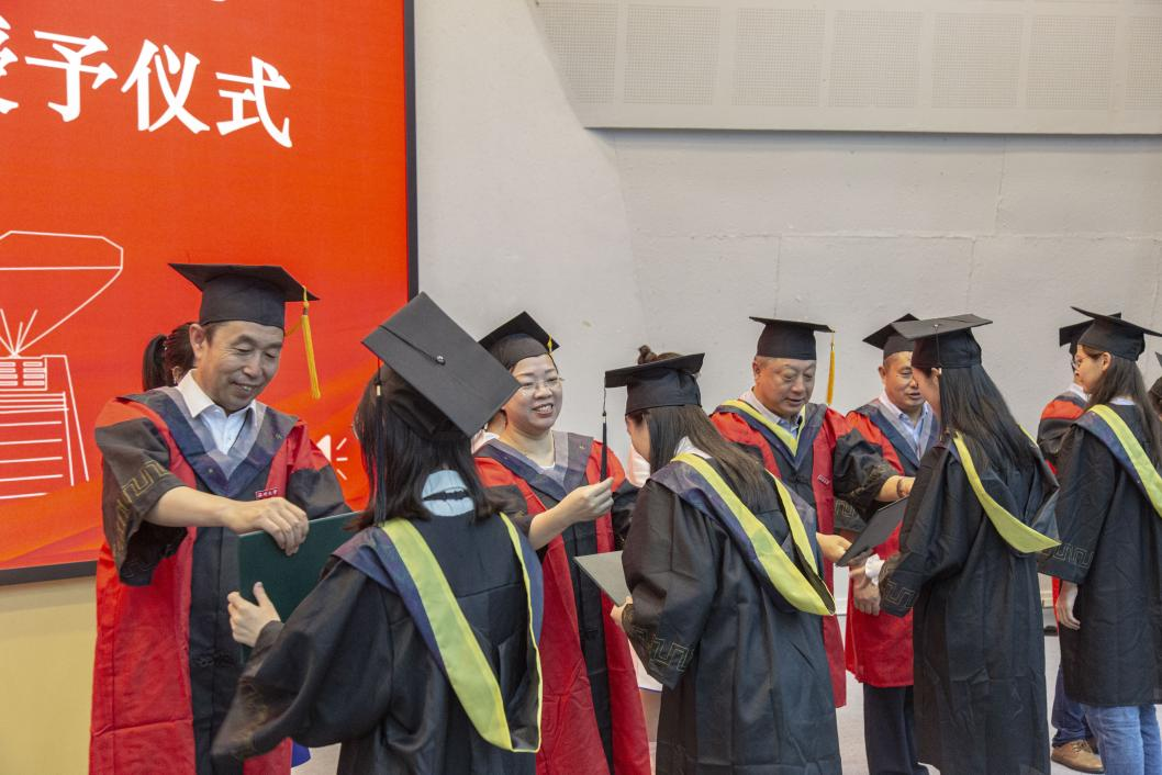 典礼最后,公司领导和学位委员会委员为全体毕业生颁发学位证书并拨穗受礼合影。
