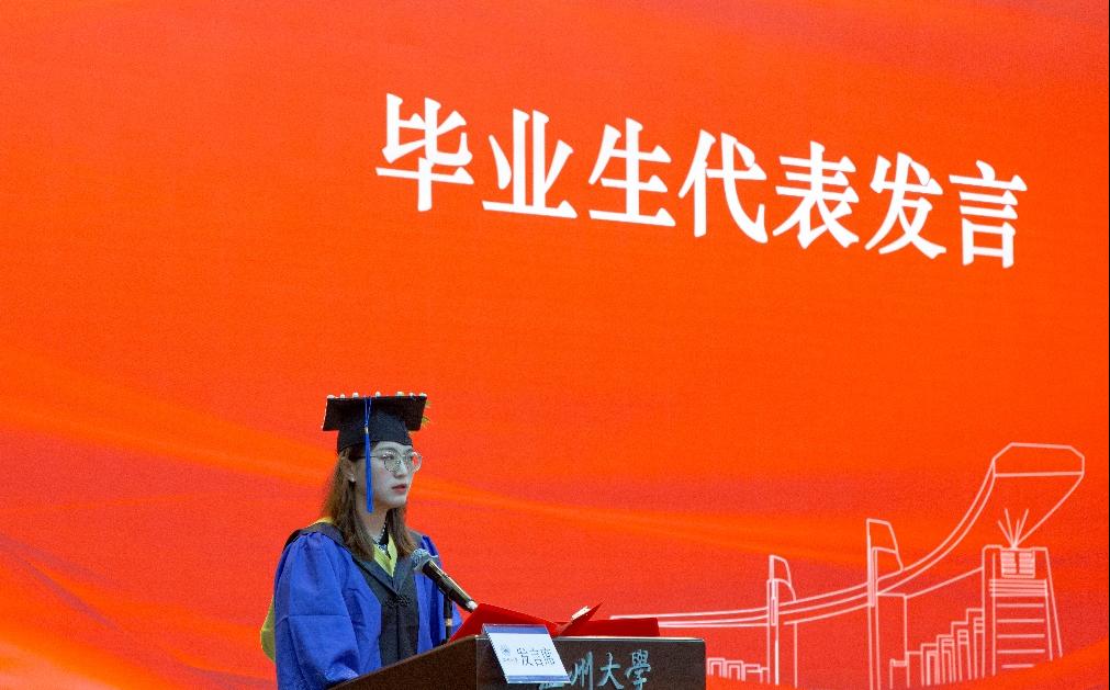 优秀毕业生代表发言。本科优秀毕业生代表19生科2班竺衍萱作“青春由磨砺而出彩,人生因奋斗而升华”的分享。四年春秋寒暑,学子们从懵懂到成熟,用奋斗和奉献涵养青春之花。她表示生环学子们将不断超越自己,跬步千里,不负韶华,不负时代,不负人民,让青春在为祖国,为人民,为人类的不懈奋斗中绽放绚丽之花。研究生优秀毕业生代表20资环李时菁作“相逢又别离,归帆又离岸”的分享。她向大家讲述了三年来自己的所思所想,强调内驱动力的重要性,表示要脚踏实地,认识真实的自己,清楚地知道自己想要什么,最终实现自己远大的梦想。