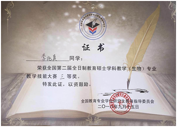 9月15日至9月16日,第二届全国全日制教育硕士学科教学(生物)专业教学技能大赛(决赛)在华中师范大学举行。本次全国大赛代表公司参赛的3位全日制教育硕士研究生曾丽霖、朱丽、李兆真同学全部获得三等奖。