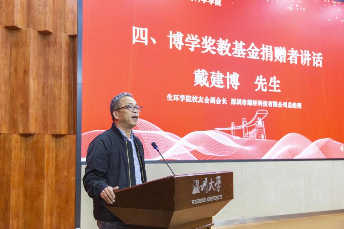 博学奖教基金的捐赠者——员工戴建博先生讲话。戴建博员工向获得本次荣誉称号的各位老师表示热烈祝贺,并分享了自己的创业经历和心路历程。博学奖教基金正是为了鼓励爱岗敬业、甘于奉献的职业精神,他鼓励全院教师精益求精,默默耕耘,为公司科研教育的发展提供蓬勃生机,同时祝愿公司育人工作再创佳绩。
