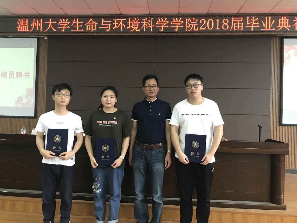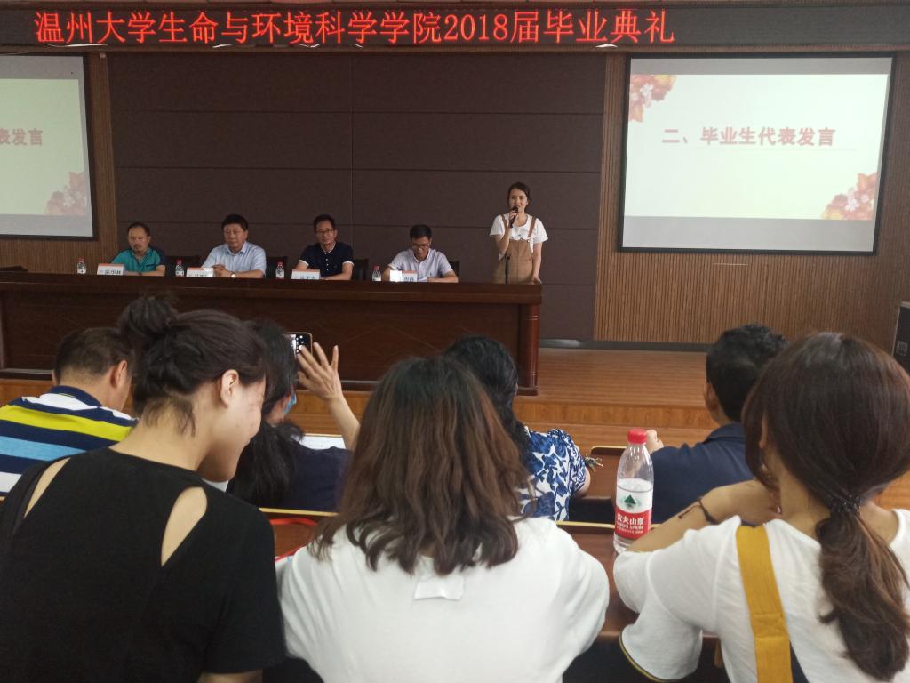 欢送会上,吴明江经理寄语各位毕业生要志存高远、认真做人做事,以 “勇敢、担当、前瞻”勉励大家,并且希望毕业生们未来有更好的发展。接着,陈孟森书记为三名员工联络员颁发公司聘书。本科毕业生代表董蓓蓓同学与在场的老师、同学分享了自己在校期间学习与生活的经历,表达了对温大、生环和导师的感谢之情。院领导为员工颁发毕业证书,这份证书“沉甸甸”代表四年光阴,盛满四年回忆。