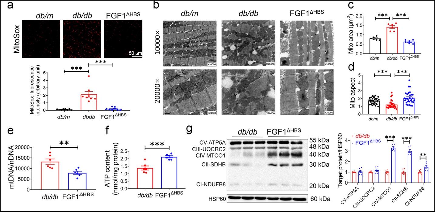 课题组研究发现血清中FGF1的含量与DCM患者的心脏功能呈正相关,而进一步的体内和体外实验则发现FGF1ΔHBS通过AMPK-Nur77信号通路缓解细胞和线粒体ROS的产生、抑制线粒体的过度分裂和细胞色素C的释放、维持线粒体膜电势的稳态以及ATP产生。而AMPK缺失小鼠中FGF1ΔHBS则丧失了这种维持线粒体稳态进而缓解DCM的作用。这项研究工作除了深入阐述FGF1ΔHBS在DCM中的保护作用及分子机制外,也为FGFs对其他能量代谢紊乱相关疾病的防治提供了新的理论依据。