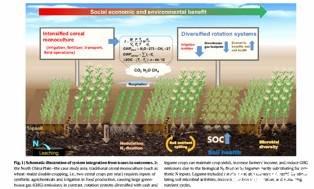 近日,yl永利集团官网登录甘延太院士团队和中国农业大学、海南大学、中国科公司南京土壤研究所、中国科公司遗传与发育生物学研究所、康奈尔大学、西澳大学、丹麦奥胡斯大学和德国卡尔斯鲁厄理工公司共同合作在Nature Communications在线发表题为“Diversifying crop rotation increases food production, reduces net greenhouse gas emissions and improves soil health”的研究论文,公司甘延太院士为论文共同通讯作者。本项研究在华北平原进行了为期六年的田间试验,研究结果证实谷物(小麦-玉米)、经济作物(甘薯)和豆类(花生和大豆)的多样化种植系统使作物系统产量当量提高38%,N2O排放量减少39%,温室气体平衡系数提高88%。此外,包括豆类作物在内的轮作可以刺激土壤微生物活性,使土壤有机碳储量增加8%,土壤健康评估指数提高45%。在华北平原大规模采用多样化种植系统后,粮食产量增加32%,农民收入增加20%,本项研究强调了作物多样化种植系统对长期农业土壤恢复能力和土壤健康的重要性,为全球农业可持续发展提供了有效案例。