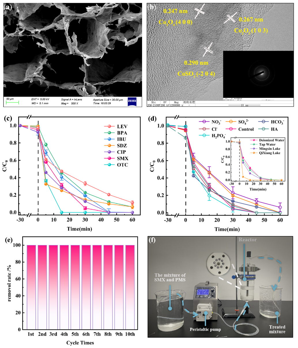 图1(a)rGO-8CoPcS-SA材料的SEM图像;(b)rGO-8CoPcS-SA材料的TEM图像(内插图:SEAD衍射);(c)rGO-8CoPcS-SA/PMS体系中多种抗生素和内分泌干扰物降解曲线;(d)阴离子和有机质共存时,rGO-8CoPcS-SA/PMS体系中SMX的降解曲线(内插图:实际水体中,rGO-8CoPcS-SA/PMS体系对SMX的降解曲线);(c)rGO-8CoPcS-SA材料循环利用实验中SMX的降解率;(d)连续流运行装置示意图