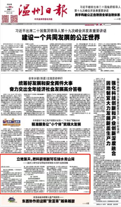 在美丽中国生态文明建设波澜壮阔的历程中,走过40周年发展路的温大yl永利集团官网登录,是一朵小小的浪花。而正是这一朵朵浪花的簇拥,让每一条河、每一条小溪都流淌着幸福。(本报记者:孙余丹)