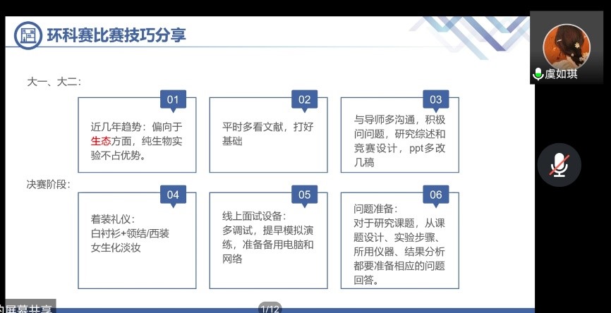 在交流会上,梁家琳老师从学科竞赛、创新创业类竞赛、员工科研项目、导师的选择这四个方面逐一展开讲述,详细介绍了各个比赛项目的开展时间及其要求,为众多同学解答了心中的疑惑;同时,梁老师为同学们展现了近年生环学子在各大赛事上的优秀表现,鼓励大一同学积极参与项目。接着陈雯雯学姐分享了她在生科赛中实验记录和实验上传的心得,在多个细节上丰富了大家对生科赛的认知,尤其是在实验规划上,陈雯雯学姐展示了她纸质和电子的实验安排,相信大一同学在以后参加生科赛等比赛的过程中能够从学姐的经验中学习,做到更充分的准备。最后是虞如琪学姐分享“互联网+”、“挑战杯”等比赛的意义和收获,分享了环科赛的多种技巧,她也期待和祝愿学弟学妹们能在之后的赛事上取得成就。