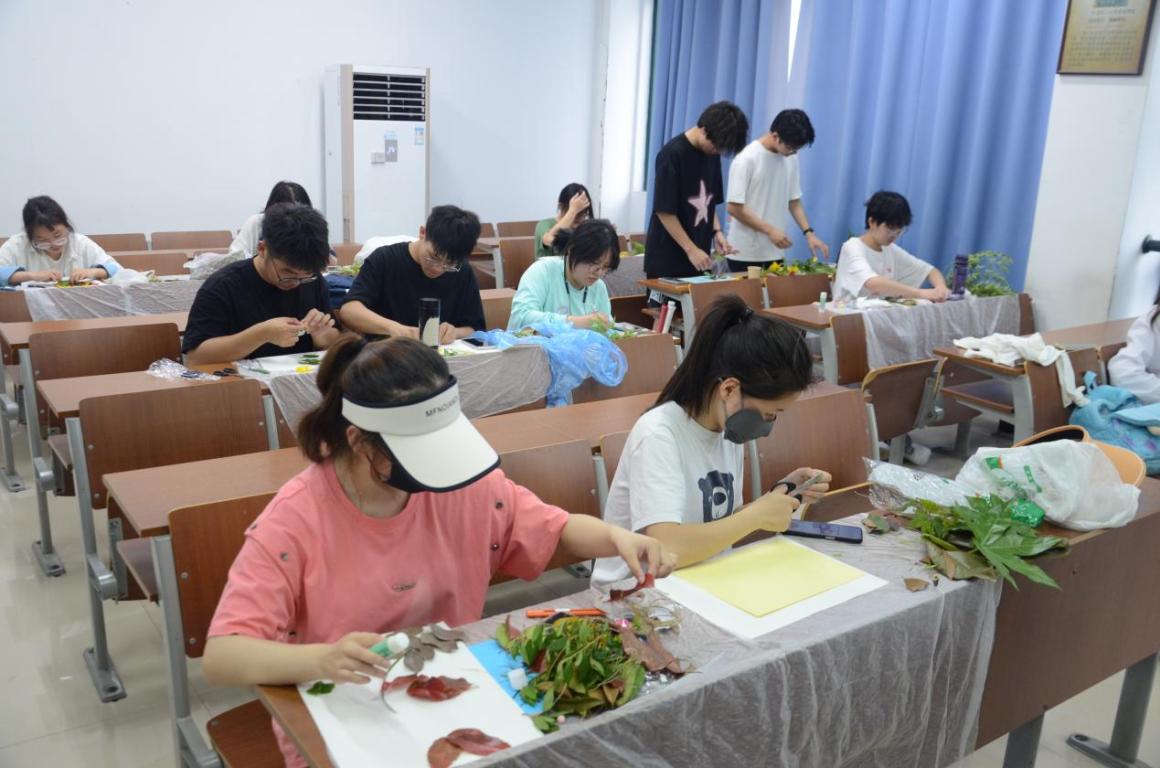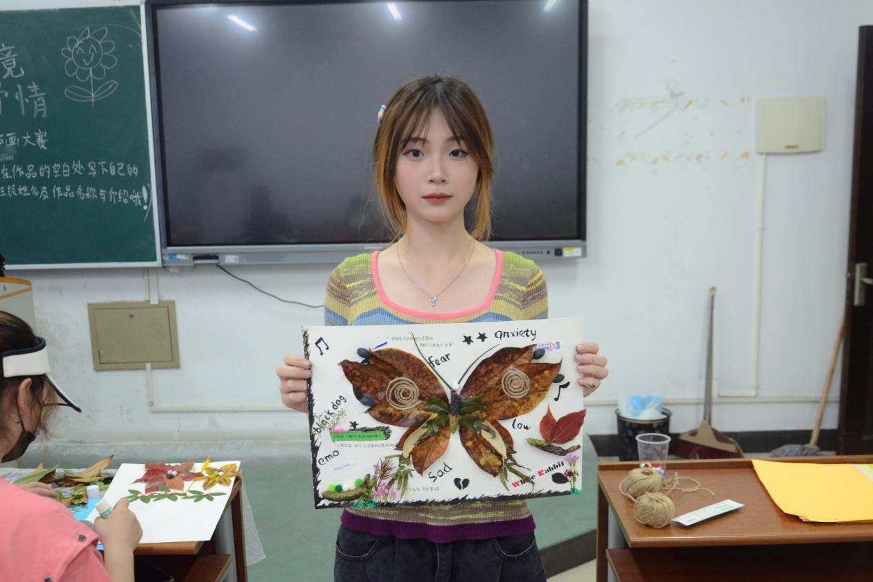 接下来是本次大赛的重头戏——拼贴画比赛。在规定时间内,同学们自备材料,用树叶、花朵和颜料等在纸上贴出自己的心情,拼成一份作品,并为它命名。制作完成后,同学们展示出自己的作品,将自己的心情图景呈现在大家面前,抒发自己的情感。
