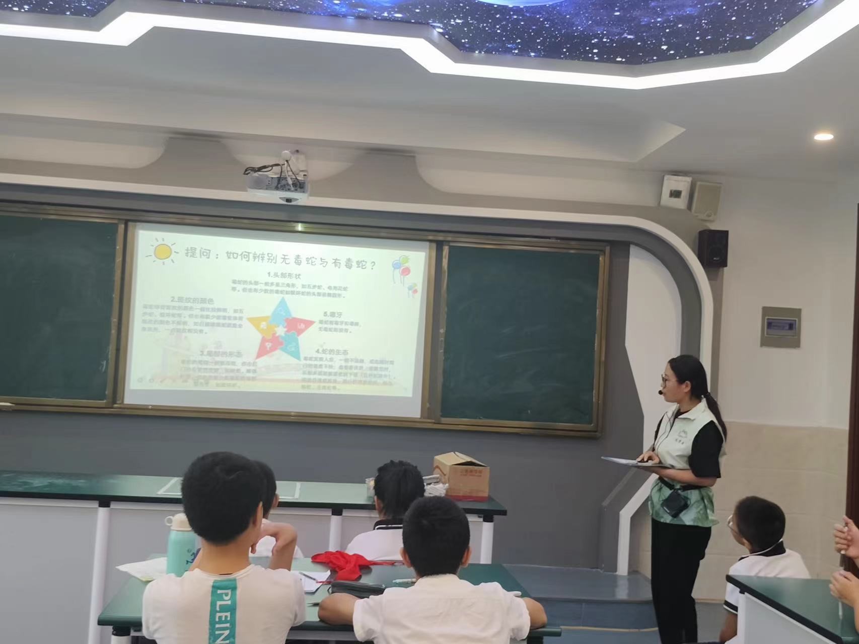 下午15:00,行动组队员杨培培同学接着进行了讲解毒蛇的课程。她以介绍蛇类的视频开始,询问孩子们对蛇的了解程度,并以此为导入,从蛇的生活习性、形态特征、种群分布等方面大致介绍了这种爬行纲有鳞目动物。而如何区分有毒蛇和无毒蛇是讲解的难点,队员以科普视频的形式向孩子们说明了如何区分有毒蛇和无毒蛇的区别方法:颜色鲜艳的不一定是毒蛇,小蛇不一定无毒;但华丽和致命并不冲突,大部分颜色鲜艳的蛇是有毒的,如竹叶青、银环蛇等。