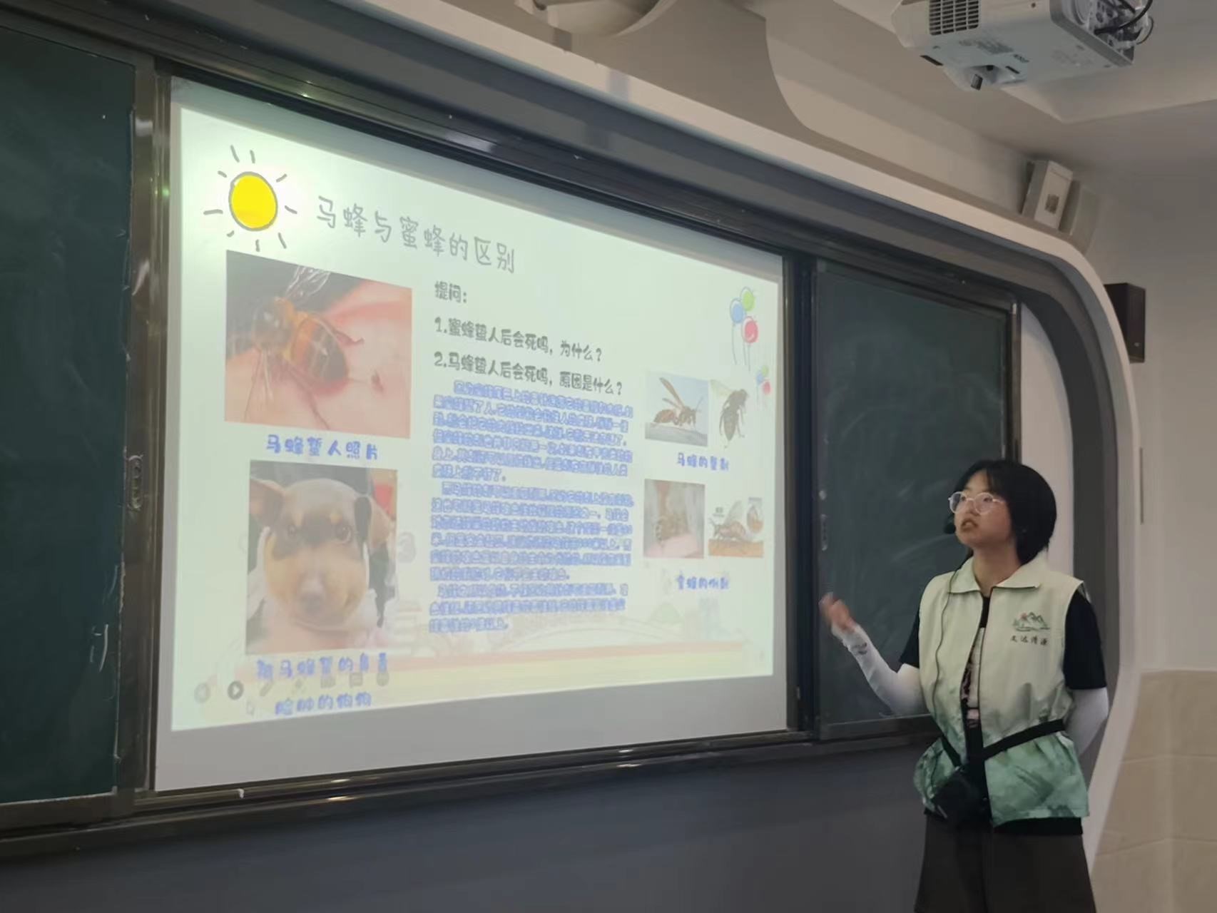 下午14:00,行动组队员翟秋芒同学开始了今天的课程。队员首先从马蜂的各种外形特征、生活习性、生长繁殖以及种群分布的特点进行介绍,帮助孩子们对马蜂有了一个大概的了解。队员接着引入马蜂的毒性,通过课堂提问的形式将蜜蜂和马蜂的毒性进行比较,以形象的图片为载入,生动地说明了马蜂的毒性是蜜蜂毒性的5倍以上,帮助孩子们正确认识到马蜂的危险。队员也以科普类视频为延伸,马蜂与蜜蜂具体表现在外观、性情、食性、巢质上的不同。除了口头介绍、文字说明等讲解形式,成员们还不间断穿插着各种小提问,在活跃课堂气氛的同时也教授了孩子们各类小知识。