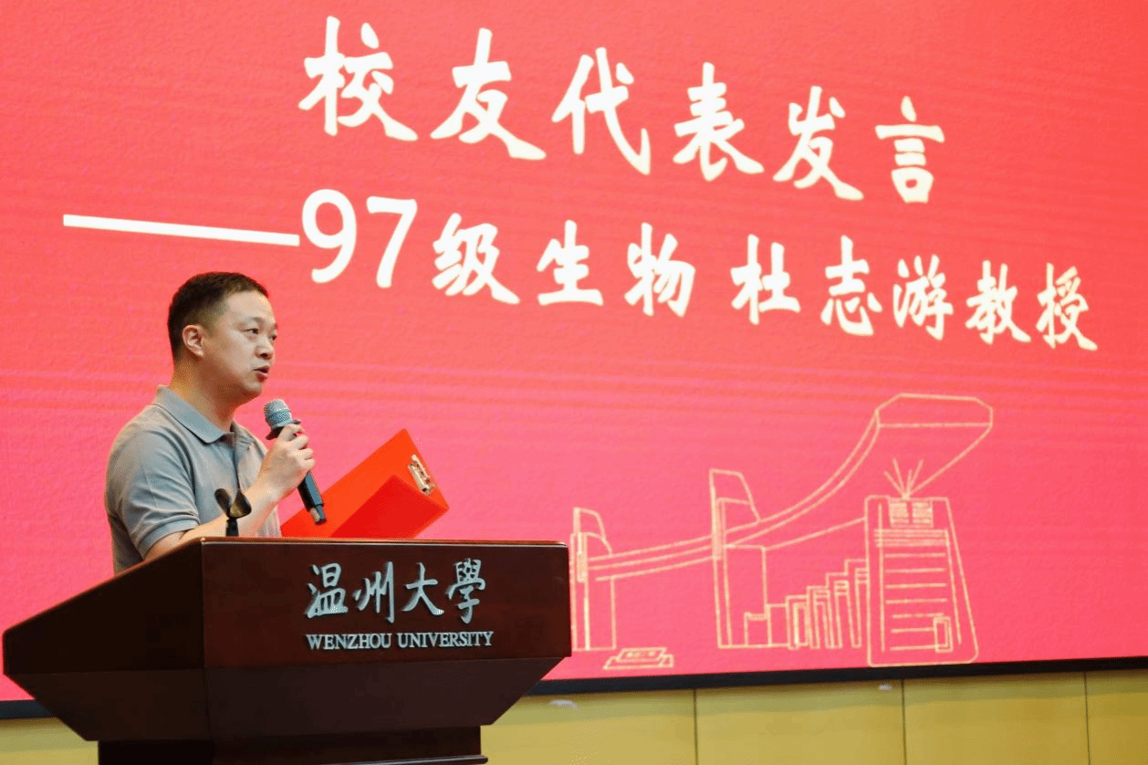 员工代表发言。97级生物优秀员工浙江理工老员工命科学与医药公司教授杜志游寄语全体毕业生,他从“热爱与坚持”、“创新与合作”、“责任与担当”三个方面分享自己作为毕业生的前辈在成长与学习中的感悟。同时,他强调了“终身学习”的重要性,以“未来属于那些相信自己梦想,并为之不懈努力的人”鼓励生环学子们继续勇敢前行。