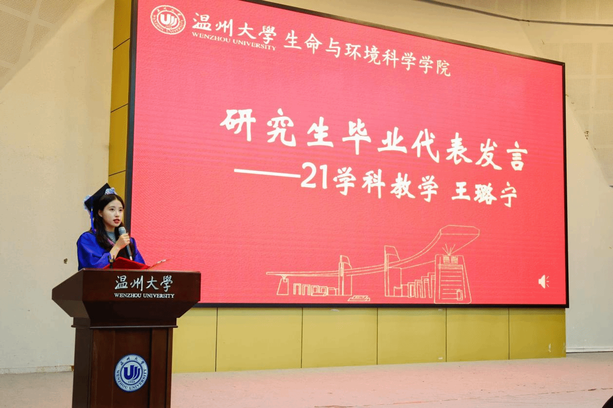 优秀毕业生代表发言。本科优秀毕业生代表20生科2班杨雨晴作“以青春之名,赴时代之约”的分享。回忆四年春秋寒暑,生环学子用奋斗和奉献涵养青春之花,当肩负时代重任,怀揣梦想,脚踏实地,以青春之名,赴时代之约。研究生优秀毕业生代表21学科教学(生物)王璐宁作“在暴风雨中跳舞”的分享。她向大家讲述了读研以来思想的转变,强调校训中“敢为人先”的“敢”字的重要性,表明敢于挑战自己是实现蜕变的第一步也是关键一步,激励全体同学们在接下来的旅途中勇于直面挑战。