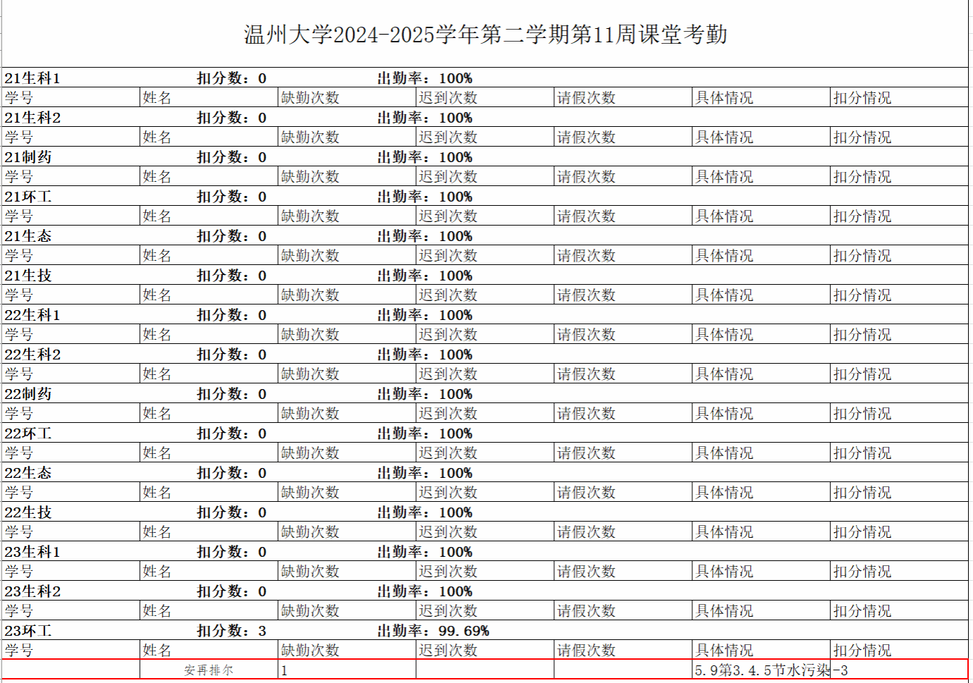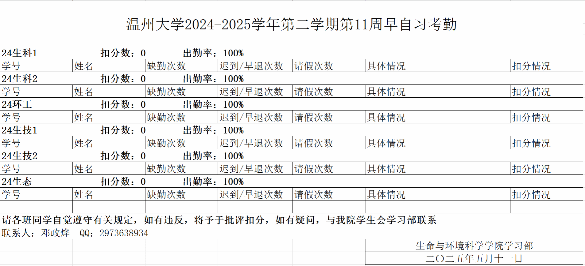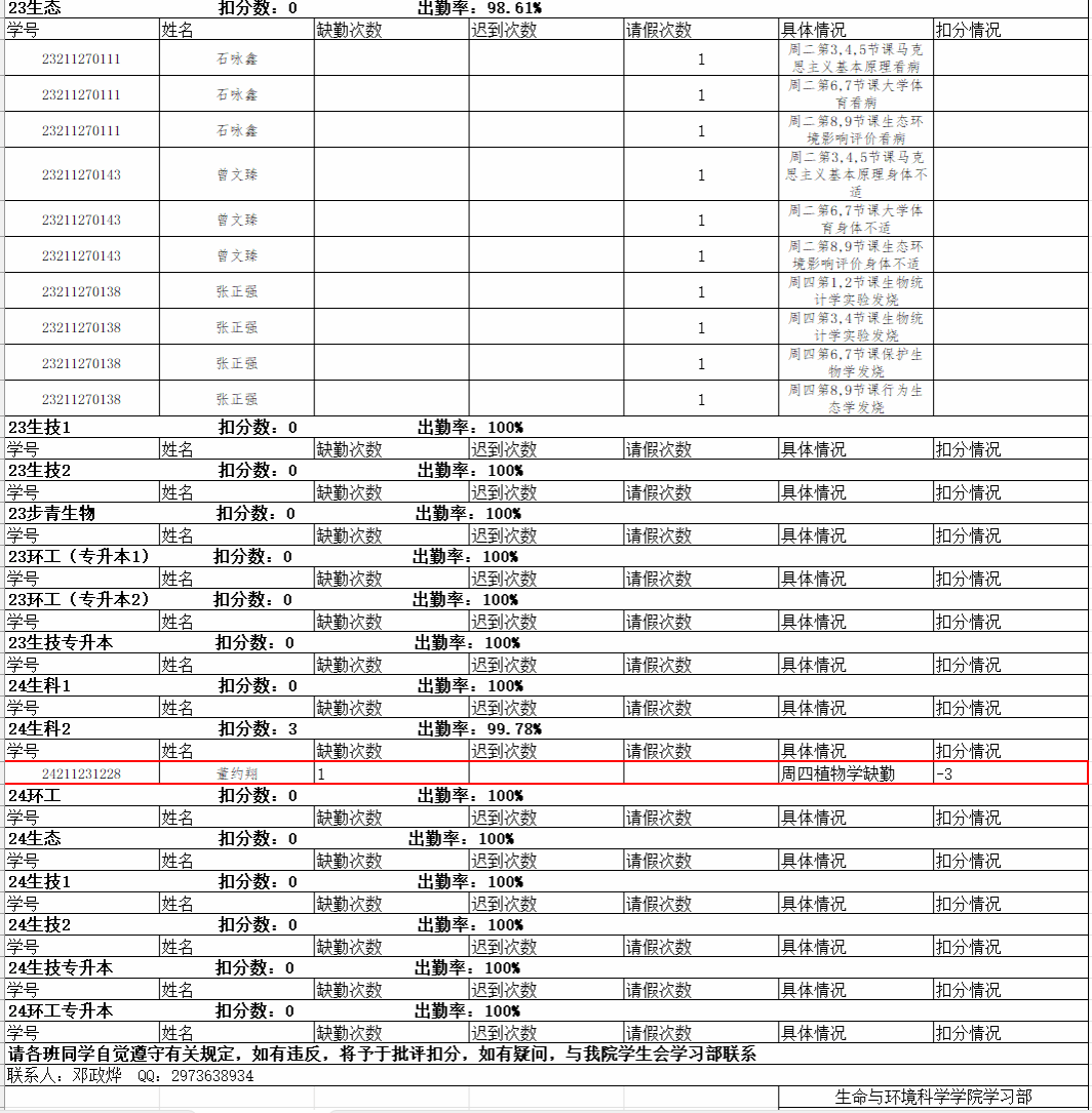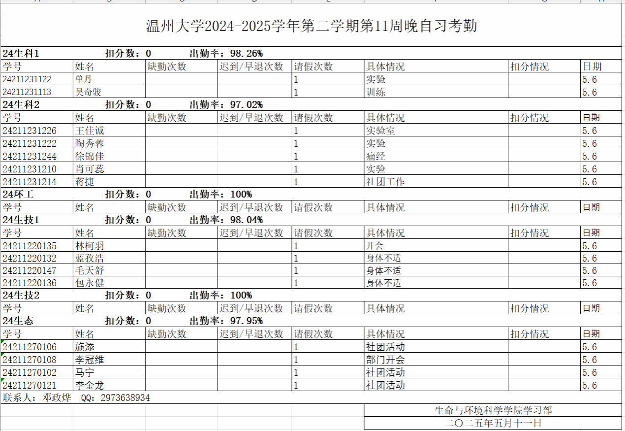 24-25学年第二学期第11周早晚自习及课堂考勤公示