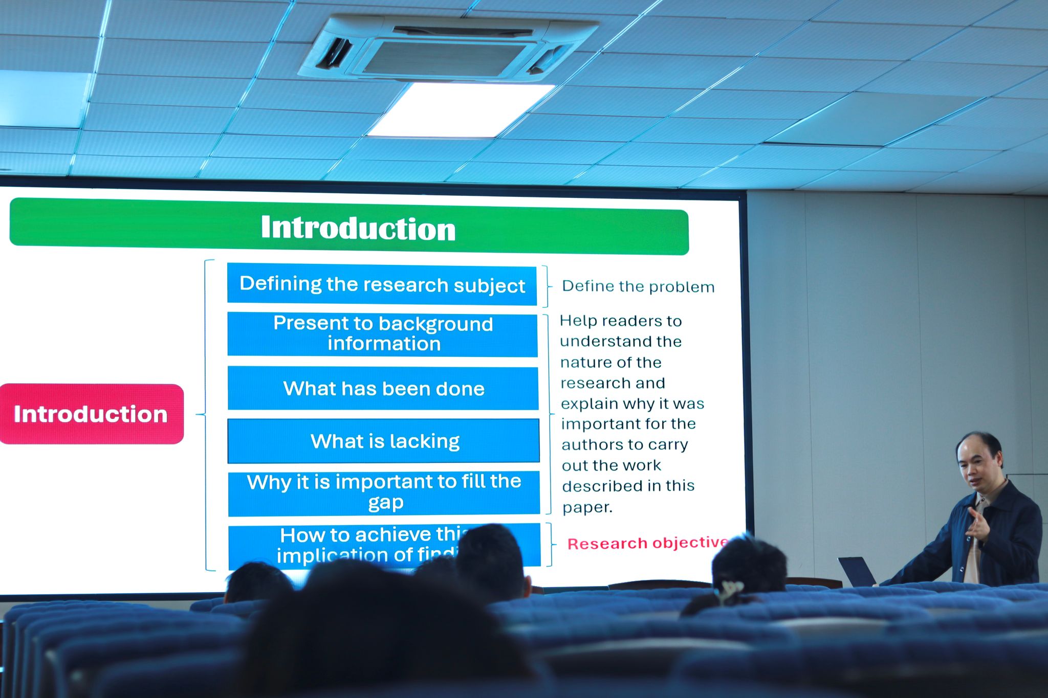 随后进入讲座的正式环节,今天讲座的主题是如何写引言。首先需要确定研究目标,解释研究目标的重要性以及前人研究成果存在的缺陷,并简要说明本篇文章的研究内容如何弥补前人的缺陷。同时,在写引言的过程中,需要适当地交代背景信息,以便读者能够充分了解文章内容,但是字数不宜太多,避免浪费读者的阅读时间。