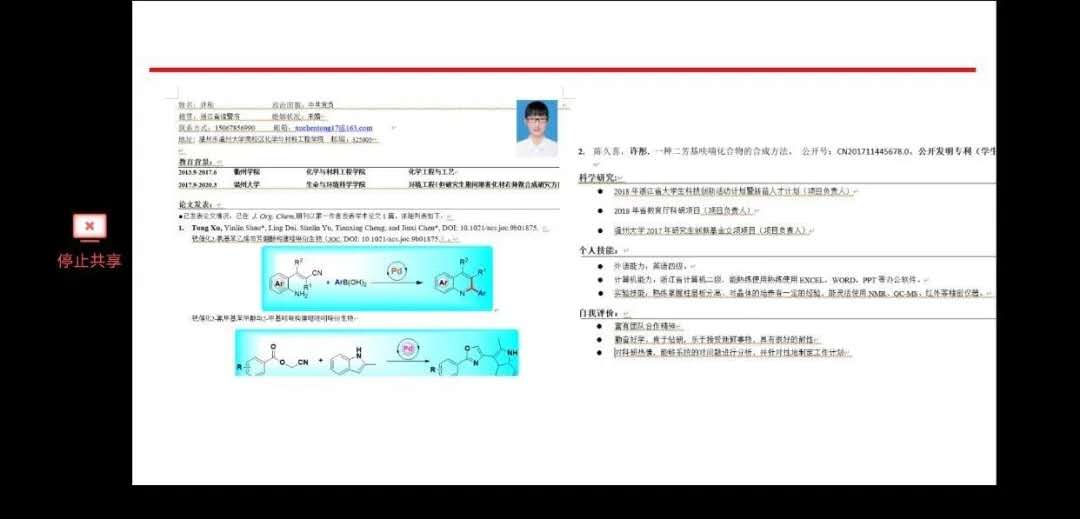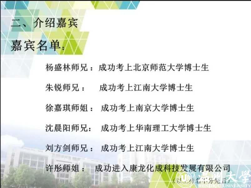 会议首先由主持人介绍嘉宾,她们分别是成功考取北京师范大学博士生的杨盛林师兄、成功考取南京大学博士生的徐嘉琪师姐、成功考取华南理工大学博士生的沈晨阳师兄、成功考取江南大学博士生的刘方剑师兄以及成功进入康龙化成科技发展有限公司的许彤师姐。