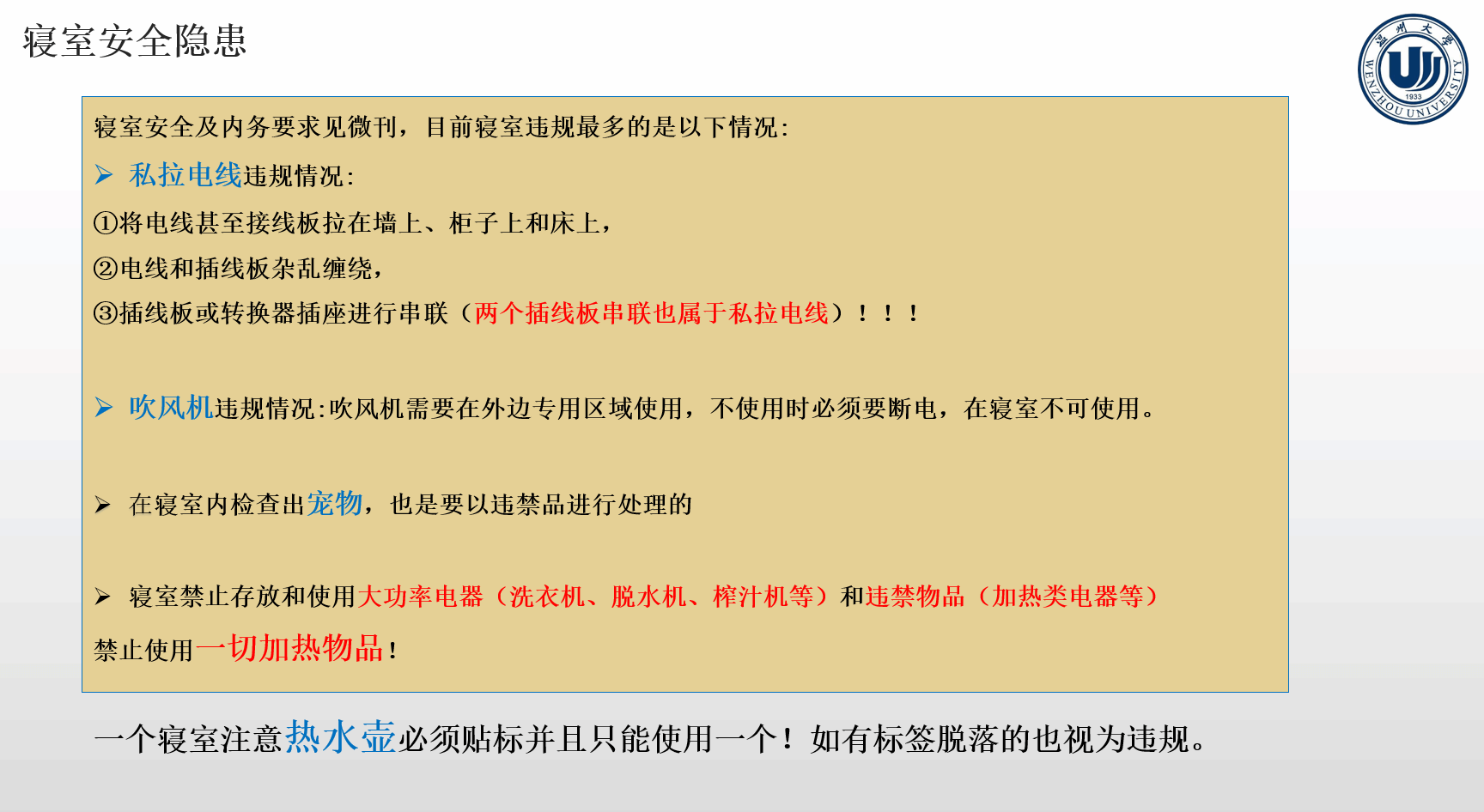 会议开始,生活实践部通过对检查的宿舍卫生及安全情况进行汇报。前几日,公司辅导员带领寝室长们进入寝室发放宣传单,他们将宣传单逐一发放到同学们手中,同时检查并指出了寝室中存在的安全隐患,还提醒大家警惕校园诈骗行为。会议强调了寝室安全及卫生的重要性并对寝室安全及内务要求做出要求,特别指出了私拉电线、违规使用吹风机、宠物饲养、大功率电器使用等违规行为,并明确了违规行为的严重后果。