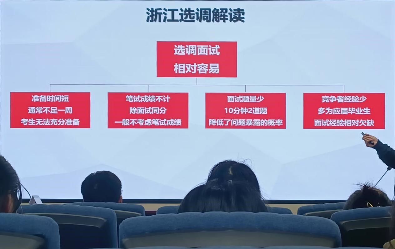 讲座伊始,周领老师就近年的考公数据对当前考公形势进行了分析,让员工们更好地知晓考试内容和要求的趋势变化。之后,周领老师分别从选调的时间、范围、条件以及流程四个方面对浙江选调进行详细解读,使员工们明确报考条件,熟悉考试内容,更好地知晓竞争态势,把握职业发展。