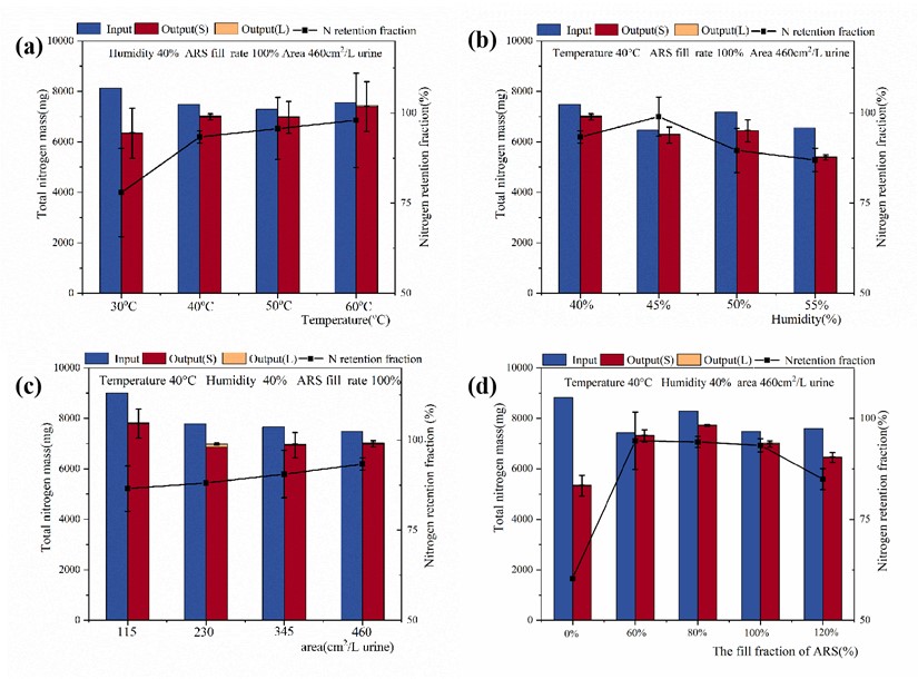 图1 不同变量下的氮的质量:(a)温度、(b)湿度、(c)面积和(d)ARS填充率;Input是指初始尿样的TN质量;Output(S)是指固体产物的TN质量;Output(L)是指冷凝物的TN质量;黑线表示氮保留分数;灰色实线表示假设10%的TN损失。