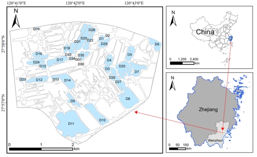 图1 本研究中的中国浙江省温州市三洋湿地的35个岛屿(蓝色)位置