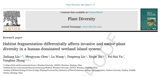 近日,yl永利集团官网登录植物生态与进化课题组在国际期刊《Plant Diversity》(中科院SCI期刊分区一区)上发表题为“Habitat fragmentation differentially affects invasive and native plant diversity in a human-dominated wetland island system”的论文。