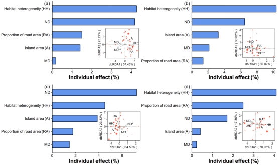 图3岛屿面积(A)、距离大陆的距离(MD)、距离最近岛屿距离(ND)、道路面积比例(RA)以及生境异质性(HH)对(a)所有入侵植物物种、(b)动物扩散、(c)风力扩散、以及(d)重力扩散入侵种物种组成的相对作用大小。每个图中的子图表示利用Bray-Curtis指数基于距离的冗余分析(dbRDA),反应各解释变量对物种组成的影响。子图中点的大小表示岛屿面积的相对大小。*P ≤ 0.05;**P ≤ 0.01