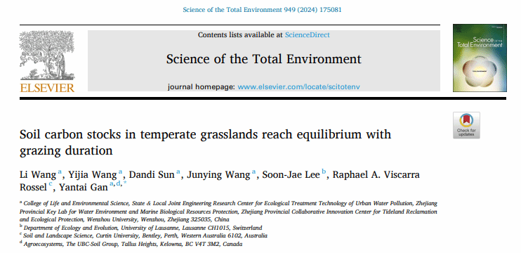 近日,永利集团官网甘延太教授团队在环境科学领域Top期刊《Science of the Total Environment》(中科院SCI期刊分区一区,IF 8.2)在线发表了题为“Soil carbon stocks in temperate grasslands reach equilibrium with grazing duration”的论文。