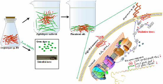 因此,李仁辉教授课题组利用产拟柱孢藻毒素的拉氏尖头藻为控制对象,深入的探讨了菌株HY溶尖头藻特征和机制,结果发现:(1)菌株HY可以通过快速絮凝、分泌活性溶藻物质(间接作用)和直接接触等三种方式攻击尖头藻,其溶藻率是目前已报到菌株中最高的;(2)代谢组学发现HY合成的溶藻活性成分可能主要为小分子的黄酮类物质,具有良好的pH酸碱和温度稳定性,而且它是第一株报道具有产黄酮能力的淡水、溶藻链霉菌;(3)HY的溶藻物质可引起尖头藻藻丝的断裂、细胞壁受损、内含物渗漏、类囊体膜结构紊乱。而且,溶藻物质还可快速抑制藻细胞的光合作用,诱导胞内合成过量的活性氧,引起氧化胁迫,造成氧化损伤,积累大量脂质过氧化产物丙二醛;(4)HY的溶藻物质可以快速抑制藻细胞内若干重要功能基因,包括光合作用相关基因(psbA,psaB,psaD,rbcL)、抗胁迫相关基因(fabZ,grpE,recA)、物质代谢相关基因(cmpA,ntcA,hetR,phoU)和拟柱孢毒素合成相关基因(cyrA,cyrB,cyrJ,cyrI)等,减少拟柱孢毒素的合成和释放,合理的平衡藻类的快速去处和毒素释放,可避免引起藻华治理过程中毒素释放引起的二次污染问题,具有一定的应用潜力。