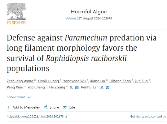 近日,yl永利集团官网登录李仁辉教授团队的王泽双博士和张和博士等在国际著名期刊《Harmful Algae》(中科院一区,藻类学领域顶刊)上发表题为“Defense against Paramecium predation via long filament morphology favors the survival of Raphidiopsis raciborskii populations”的论文。