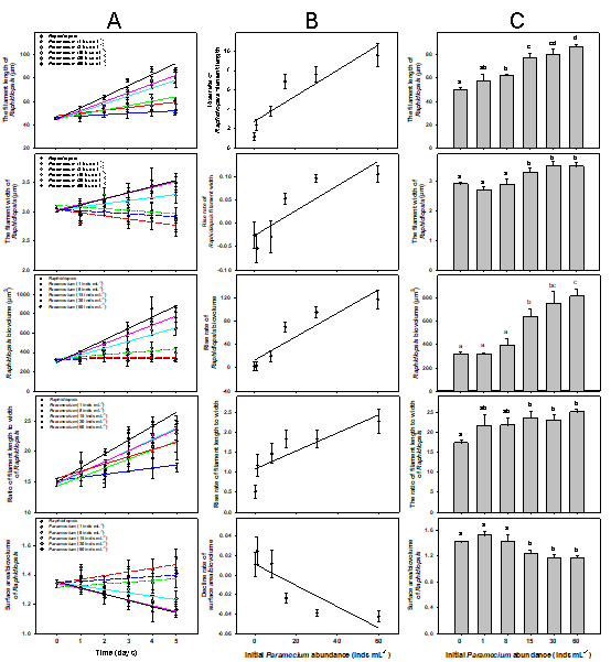 图2 暴露于不同初始密度草履虫的拉氏尖头藻的形态学变化。(A)实验期间拉氏尖头藻形态特征的变化;(B)拉氏尖头藻各个形态学指标随草履虫初始密度变化的增减速率;(C)实验末期拉氏尖头藻的形态特征。