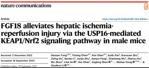 近日,yl永利集团官网登录申景岭教授与温州医科大学李校堃院士团队合作在Nature Communications在线发表题为“FGF18 alleviates hepatic ischemia-reperfusion injury via the USP16-mediated KEAP1/Nrf2 signaling pathway in male mice”的研究论文。本项研究结果证实成纤维细胞生长因子18(FGF18)可显著改善肝缺血再灌注过程中的损伤。FGF18通过减少USP16的表达,增加了KEAP1的泛素化修饰水平,从而激活Nrf2信号并最终改善肝脏缺血再灌注损伤。其中FGF18对USP16调控作用是通过Nrf2和USP16的负反馈调控来实现的。研究发现FGF18通过降低氧化应激以及炎症水平,减少肝细胞的凋亡,因此靶向FGF18/USP16/KEAP1信号通路可作为临床上改善肝脏缺血再灌注损伤和相关病理过程的一种新策略。该论文通讯作者为温州医科大学药公司李校堃院士、丛维涛研究员、yl永利集团官网登录申景岭教授。