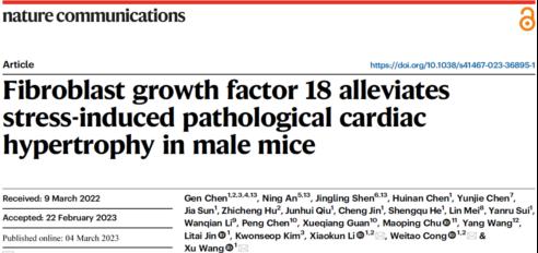 今年4月份申景岭教授与李校堃院士团队合作以共同第一作者身份在Nature Communications发表题为“Fibroblast growth factor 18 alleviates stress-induced pathological cardiac hypertrophy in male mice”的研究论文,详细介绍了病理性心肌肥大病变过程中FGF18所扮演的角色及相关机制,并阐明FGF18通过激活心肌细胞中FYN改善氧化应激,为病理性心肌肥大的治疗提供了新的研究思路及靶点。