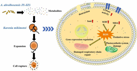 有害藻华(HABs)是全球性的环境问题,对海洋生态系统和人类健康构成重大威胁。溶藻细菌作为防治HABs的一种有前景的生物方法有待深入研究。为此,研究团队利用前期研究中发现的溶藻细菌A. abrolhosensis JY-JZ1对米氏凯伦藻的溶藻特性和机制进行了探究,并对菌株JY-JZ1代谢产物中的溶藻物质进行了分析。研究发现JY-JZ1的培养菌液作用下,米氏凯伦藻的最大量子产率(Fv/Fm)、相对电子传递速率(rETR)、最大相对电子传递速率(rETRmax)和光合效率(α)显著下降,表明光合作用系统遭到损坏。活性氧(ROS)和丙二醛(MDA)的显著升高,以及抗氧化酶的活性增加,表明米氏凯伦藻受到菌培养液的氧化胁迫。显微观察和碘化丙啶(PI)染色证实了藻细胞膜结构完整性遭到破坏。藻细胞内参与光合作用、呼吸作用和细胞壁完整性的相关基因表达水平发生变化,揭示了溶藻的分子机制。对菌培养液的代谢物分析,发现了多种潜在的溶藻物质,其中5种为首次报道并已证实具有米氏凯伦藻的溶藻活性。这些结果表明,菌株A. abrolhosensis JY-JZ1 在控制有害藻华方面具有显著应用潜力,并提供了多种具有应用前景的溶藻活性化合物。