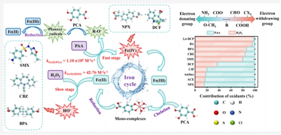这两个阶段对各种污染物降解的贡献不同。机理研究显示,Fe(IV)是PAA阶段污染物降解的主要活性物质,而在H2O2阶段,•OH占据主导地位。H2O2丰富了RSs的生成途径和类型。研究发现除PCA本身外,其与活性物种反应生成的酚氧自由基中间体对Fe(III)还原起关键作用,这解释了为何该体系能持续维持足量Fe(III)以继续与H2O2反应。本研究揭示了共存H2O2的协同作用,为优化基于PAA的类芬顿体系在实际水体污染物降解中的应用提供了新见解。