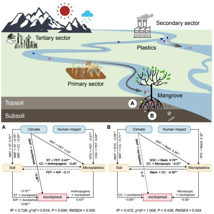 研究发现,中国红树林土壤表层(0-20cm)微塑料丰度(高达6,516 particles/kg)显著富集,约为次表层(20-40cm)的3倍;表层微塑料通过4条路径与甲烷循环微生物相互关联,而次表层仅2条,揭示了微塑料对表层微生物群落结构和功能的深远影响;第二产业是表层土壤微塑料污染的关键驱动力,其与产甲烷菌/甲烷氧化菌基因(mcrA/ pmoA)比值呈正相关,表明微塑料污染增强了甲烷生成潜力。该成果揭示了第二产业塑料污染通过正向影响红树林产甲烷菌削弱红树林的净碳汇能力,强调了治理微塑料污染对于保护蓝碳生态系统的紧迫性和重要性。