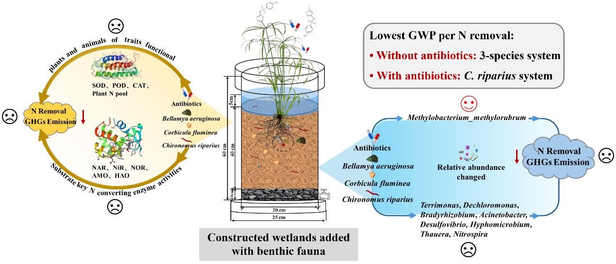 研究发现:在单一底栖动物系统中,抗生素提高了出水氮浓度,而在无底栖动物系统中则使硝态氮降低了42%。抗生素和底栖动物多样性显著影响温室气体排放:无抗生素时,三物种系统单位氮去除的GWPCH₄+N₂O+CO₂最低(降低265%);有抗生素时,岸溪摇蚊幼虫(C. riparius)系统最低(降低637%),且抗生素进一步增强其效应(降低372%)。总体表明,无抗生素条件下提升底栖动物多样性有利于污染物去除和减排,而在抗生素胁迫下,引入耐受性关键物种C. riparius更有效。
