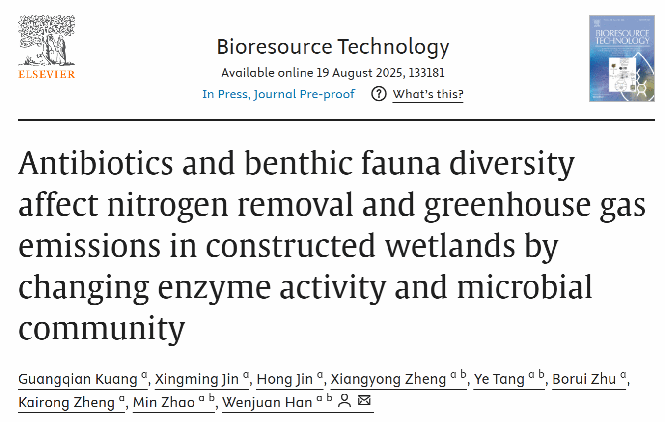 近日,公司赵敏团队在中科院一区TOP期刊《Bioresource Technology》发表了题为“Antibiotics and benthic fauna diversity affect nitrogen removal and greenhouse gas emissions in constructed wetlands by changing enzyme activity and microbial community”最新研究。该研究聚焦抗生素污染对人工湿地(CWs)氮去除及温室气体排放的影响,深入探究了底栖动物多样性在其中的调节作用。
