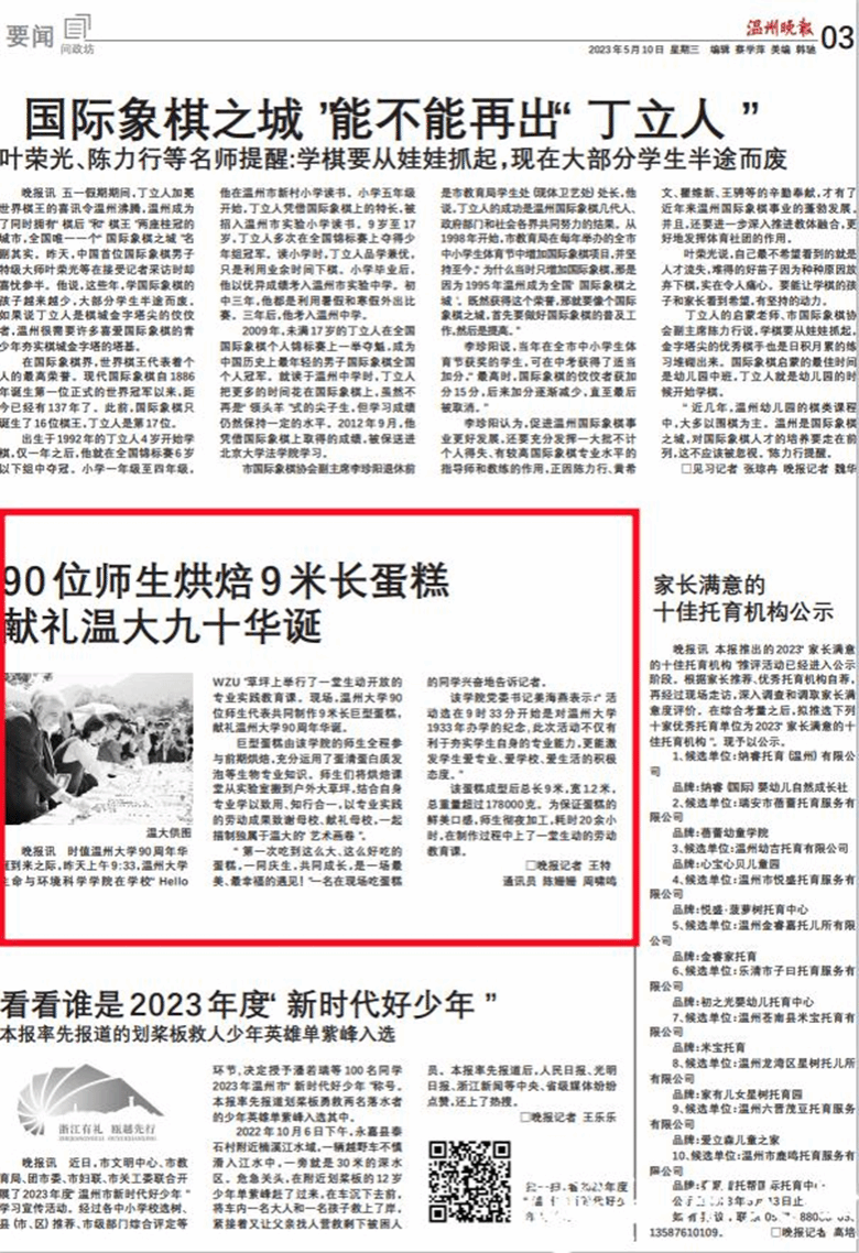 晚报讯时值永利集团官网90周年华诞到来之际,昨天上午9:33,yl永利集团官网登录在公司“HelloWZU”草坪上举行了一堂生动开放的专业实践教育课。现场,永利集团官网 90位师生代表共同制作9米长巨型蛋糕,献礼永利集团官网90周年华诞。