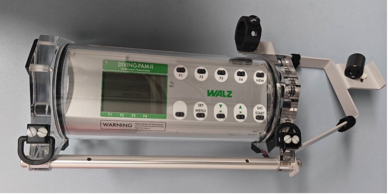 DIVING-PAM-II是德国WALZ公司推出的用于水下原位测量的调制叶绿素荧光仪,由通用型主机,光纤,通用样品架,暗适应叶夹,磁性叶夹,表面叶夹,软件等组成。其核心为台坚固的防水主机与标配水下测量探头,采用调制荧光技术,可在环境背景光下,非侵入式地直接检测水生光合生物(如大型藻类、水生植物、珊瑚)叶片或组织发出的极微弱叶绿素荧光信号。可潜水或在浅水区直接使用,实现对光合系统II(PSII)生理参数的现场、实时测量。