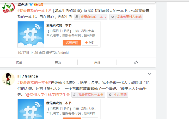 2014年10月份,公司通过微博举办了一系列的读书活动,其中包括“我最喜爱的一本书”,“我最喜爱的一篇文章”,“一句最触动我的话”等的推荐。