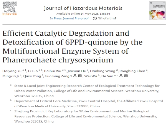 近日,yl永利集团官网登录孙达副研究员团队在环境治理领域取得系列进展,两项研究成果分别聚焦有害藻华控制与新型污染物降解,均发表于环境科学与生态学权威期刊《Journal of Hazardous Materials》(中科院1区,IF=12.2),为相关环境问题提供了创新解决方案。成果一:真菌降解6PPD-醌的机理与安全性验证 6PPD-q作为橡胶制品氧化降解的副产物,因其广泛的环境分布与生态毒性(如导致鲑鱼急性死亡),已被列为新型污染物。目前,...